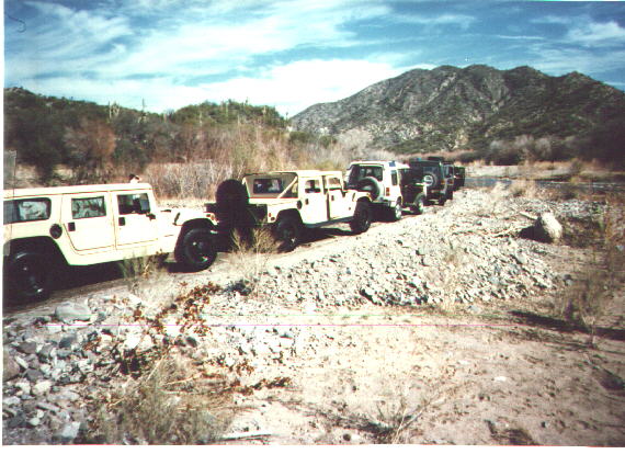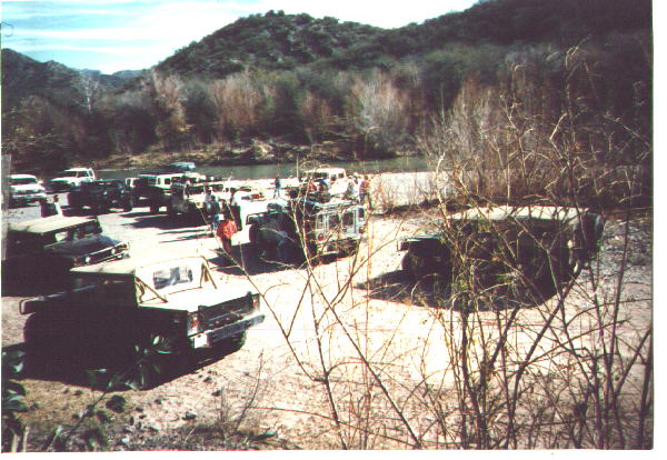 By Saturday morning, there were enough folks on hand to do a run with 15 Hummers. I missed this run, but they went through Copper Creek and Turkey Creek in the northern part of the beautiful Galiuro Mountains. They passed "Rug Hill", ran out of road and ended up in Klondike, Az. They made it through to Globe, Az. where they overwhelmed a gas station. They didn't make it back to base camp until 9:30 pm. The sight of all those Hummers arriving at night was truly awesome. The cookout had started long before, but continued well after. The elk and antelope burgers (thanks, Eb) were great, as was the salmon. Rick from Vegas brought some steaks and chicken, and Brandon brought a 20-lb. turkey.