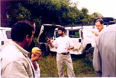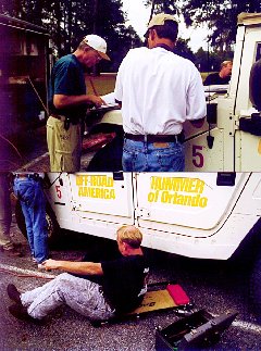 | At other times, we had to follow intricate road directions through paths in the forest. These were regulated by distance and speed of vehicle. Arriving too fast or too late resulted in loss of points. Here, Hal Johnson is talking to other Hummer drivers after the last day TSD (time, speed, distance) race. |