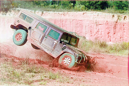 | The High Speed Obstacle Course was a true challenge. It started at the Water Hole, and continues through some difficult turns, hills and a log roll about 200 feet long. This vehicle became airborn as it hit the 4-foot high mound going into the 3 feet of water and mud. |