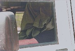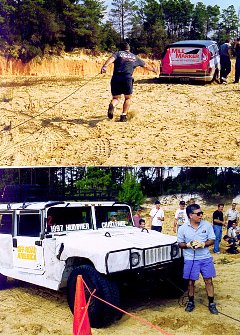 | Winching was also done in the PITS. The object was to winch your own Hummer first in one direction, detach the cable, and re-attach it to a cable 90 degrees to it, and then pass some cones. The timing was done only when the vehicle was not moving (to account for varying speed of winches). Joe Cama is doing a great deal of work here holding the switch, while his navigator Jim Patton is pulling the winch cable. |