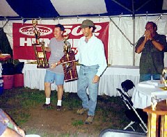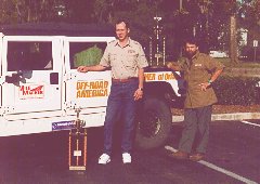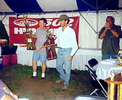 | Off-Road American gave a wonderful dinner at their facility. Here, Bill Myers and his navigator accept First Place at the ceremony. The sponsors were great at helping with the whole affair. They were present throughout. The MileMarker people were with us to the end. Hummer of Orlando did the repairs of broken half-shafts, transfer cases, etc. Off-Road America showed us their great facilities, including the 502 Conversion. For me, the whole experience was spectacular. Joe Cama, Towanda, PA |